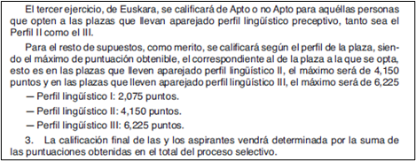 Así, la calificación de apto otorgada a quien hubiera superado el ejercicio obligatorio de conocimiento del euskera no puede ser sustituida por la puntuación prevista en la convocatoria para el caso de acreditación del correspondiente nivel de perfil lingüístico; en defecto de previsión en la convocatoria o norma vigente a la fecha de su publicación de tal conversión a efectos de constitución de la relación de integrantes de la bolsa; no decimos a otros efectos, como sostiene la apelante con amparo en la base general décimo sexta.