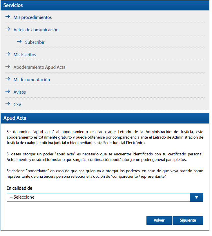 Una vez dentro, veréis a la izquierda de la pantalla, en Servicios, la opción de Apoderamiento Apud Acta. Pinchad en nuevo y os saldrá esta pantalla: